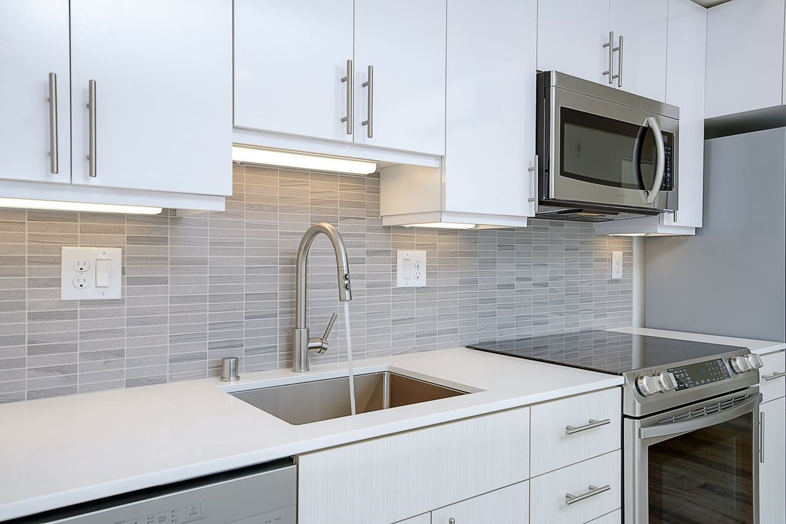 • Hard surface countertops and tile backsplashes